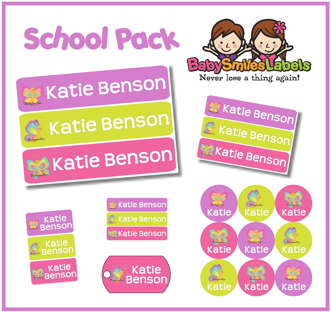 Our School Pack contains all the popular labels you need to help your kids stay organized for school!  Perfect to label school supplies, backpacks, water bottles, lunchboxes, clothing and much more!  We offer a wide variety of fun and stylish designs, colors and font types to match your unique style.  Personalize your labels today and ensure belongings return home again!