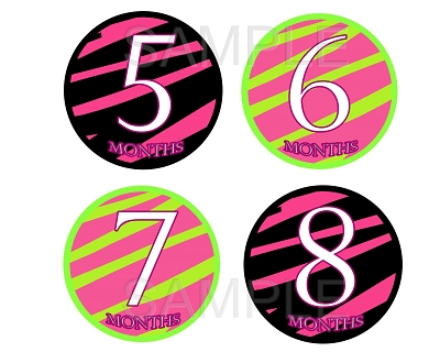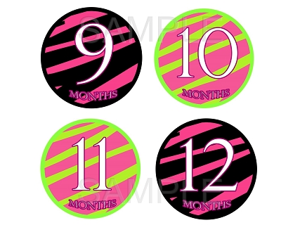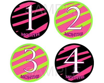 Cecily - Pink Zebra Patterns Monthly Photo StickersAww… so cute! What a beautiful way to document your baby’s monthly growth in the first year of life!  BabySmiles monthly photo stickers look absolutely adorable on babies for picture taking.  You will love this new, fun way to capture your baby’s milestones.  These stickers will make your photos truly special and make your memories last a lifetime!