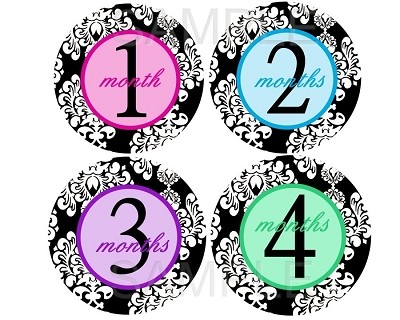 Farah - Multi Colored Damask Monthly Photo StickersAww… so cute! What a beautiful way to document your baby’s monthly growth in the first year of life!  BabySmiles monthly photo stickers look absolutely adorable on babies for picture taking.  You will love this new, fun way to capture your baby’s milestones.  These stickers will make your photos truly special and make your memories last a lifetime!