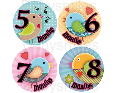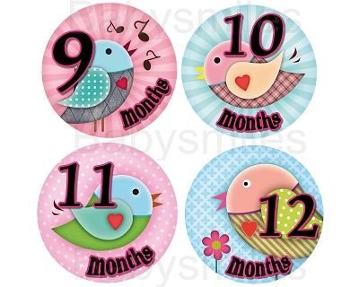 Kaelyn - Sweet Lovely Girly Birds Monthly Photo StickersAww… so cute! What a beautiful way to document your baby’s monthly growth in the first year of life!  BabySmiles monthly photo stickers look absolutely adorable on babies for picture taking.  You will love this new, fun way to capture your baby’s milestones.  These stickers will make your photos truly special and make your memories last a lifetime!