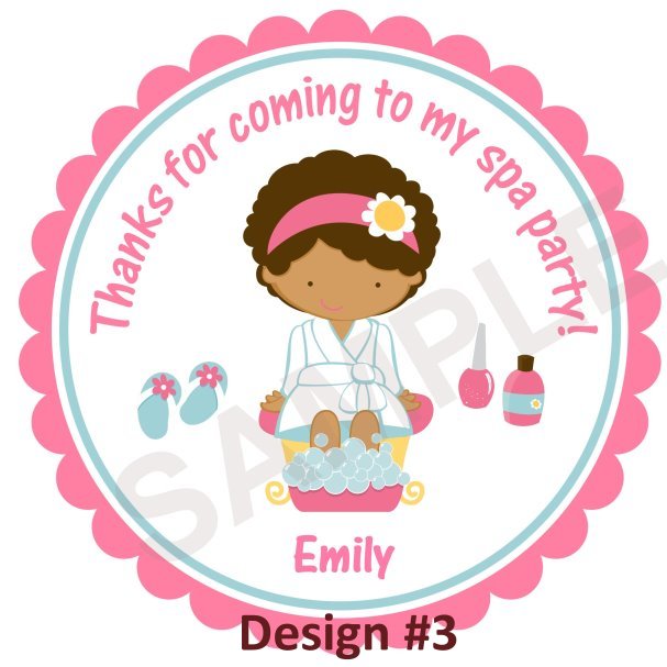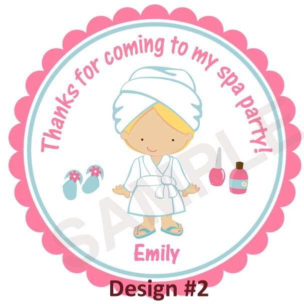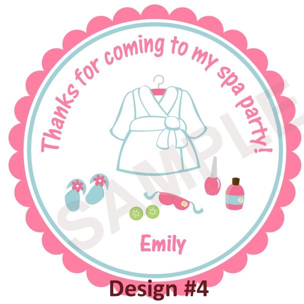 Spa Party Personalized StickersSpa Party Personalized Stickers♥ Unlimited use with these cute and unique PERSONALIZED stickers!  Perfect to use for parties and to match your party theme! These stickers can be used on everything!  Stick them on party favors, gifts, goodie bags, thank you notes, envelope seals, address labels, cards, wrapped baked treats, and more! The possibilities are endless!